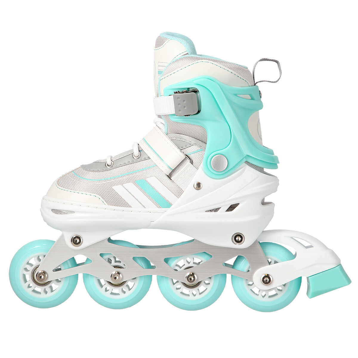 Hliníkový podvozek je osazen měkkými PU kolečky s ložisky ABEC7 pro svižnou jízdu. Vnější bota je pomocí stisku tlačítka nastavitelná do čtyř velikostí, toto řešení umožňuje precizní přizpůsobení velikosti podle aktuálních potřeb anebo se používá jako "rostoucí bota", která "roste" spolu s nohou dítěte. Na špičce jsou ventilační otvory pro maximální prodyšnost. Vnitřní bota je vyrobena z kombinace semiše, síťoviny MESH, EVA a pěny o vysoké hustotě. Zapínání je řešenou klasickou trojkombinací - šněrování, řemínek se suchým zipem a dvousekční přezka. Součástí balení je také pár nožů na led, které jsou vyrobeny z nerez oceli s vysokým podílem uhlíku.