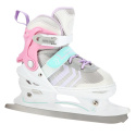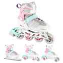 NILS Extreme NH18192 jsou kolečkové brusle 4v1 s vyměnitelným nožem na led, které jsou určeny pro začínající a středně pokročilé uživatele. Hliníkový podvozek je osazen měkkými PU kolečky s ložisky ABEC7 pro svižnou jízdu. Vnější bota je pomocí stisku tlačítka nastavitelná do čtyř velikostí, toto řešení umožňuje precizní přizpůsobení velikosti podle aktuálních potřeb anebo se používá jako "rostoucí bota", která "roste" spolu s nohou dítěte. Na špičce jsou ventilační otvory pro maximální prodyšnost. Vnitřní bota je vyrobena z kombinace semiše, síťoviny MESH, EVA a pěny o vysoké hustotě. Zapínání je řešenou klasickou trojkombinací - šněrování, řemínek se suchým zipem a dvousekční přezka. Součástí balení je sada šroubů a podložek pro přestavbu podvozku do konfigurace 2+1 a 2+2 a pár nožů na led, které jsou vyrobeny z nerez oceli s vysokým podílem uhlíku.