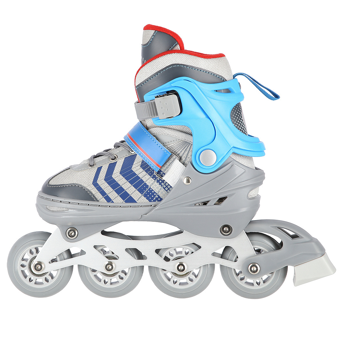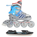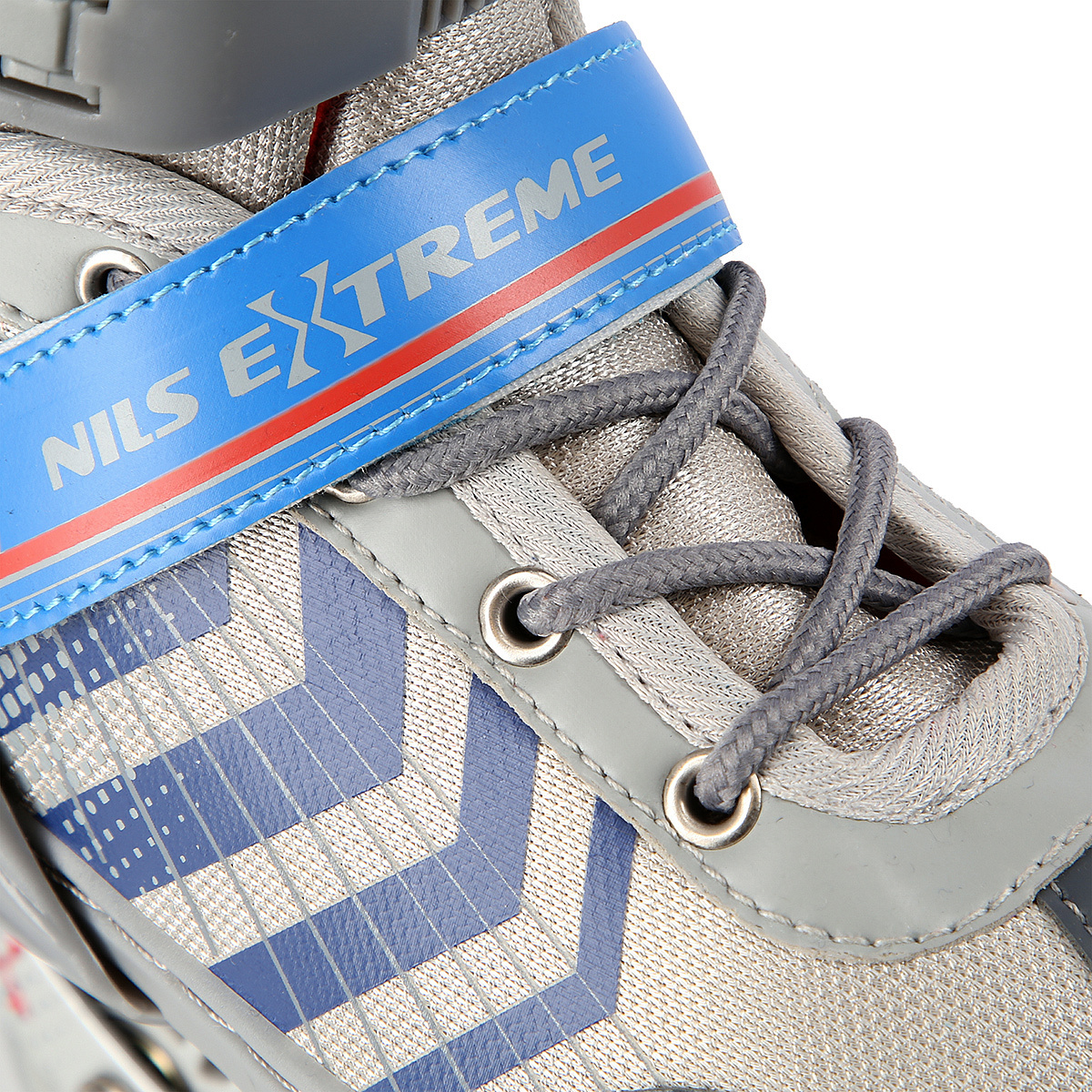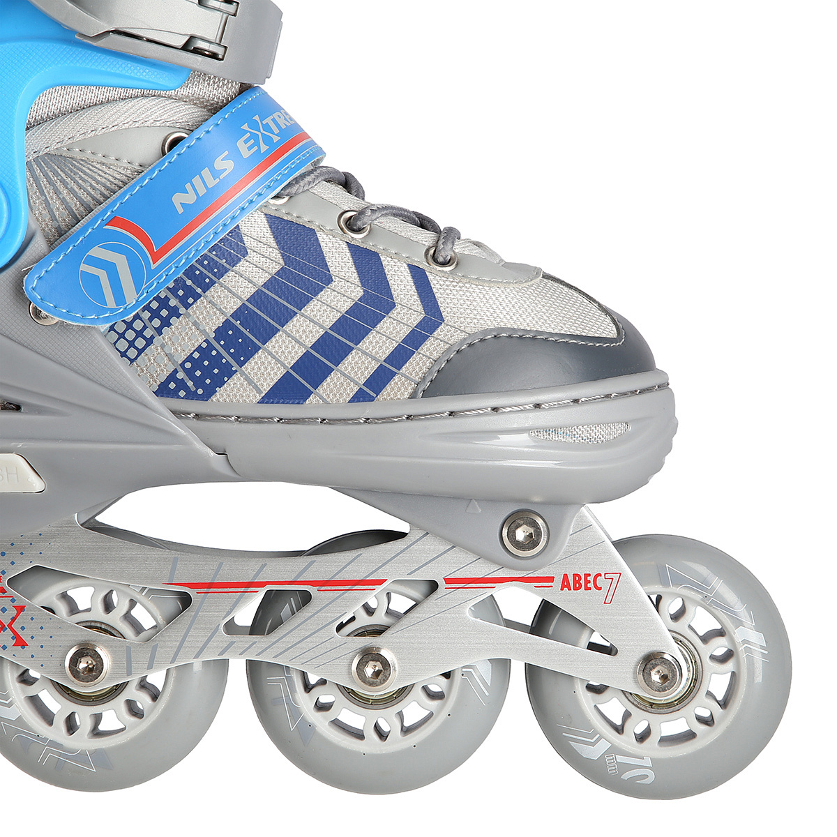 NILS Extreme NH18192 jsou kolečkové brusle 4v1 s vyměnitelným nožem na led, které jsou určeny pro začínající a středně pokročilé uživatele. Hliníkový podvozek je osazen měkkými PU kolečky s ložisky ABEC7 pro svižnou jízdu. Vnější bota je pomocí stisku tlačítka nastavitelná do čtyř velikostí, toto řešení umožňuje precizní přizpůsobení velikosti podle aktuálních potřeb anebo se používá jako "rostoucí bota", která "roste" spolu s nohou dítěte. Na špičce jsou ventilační otvory pro maximální prodyšnost. Vnitřní bota je vyrobena z kombinace semiše, síťoviny MESH, EVA a pěny o vysoké hustotě. Zapínání je řešenou klasickou trojkombinací - šněrování, řemínek se suchým zipem a dvousekční přezka. Součástí balení je sada šroubů a podložek pro přestavbu podvozku do konfigurace 2+1 a 2+2 a pár nožů na led, které jsou vyrobeny z nerez oceli s vysokým podílem uhlíku.