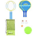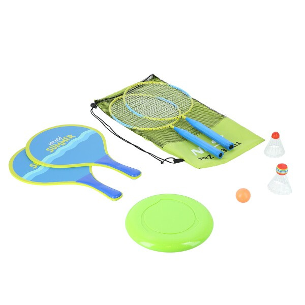 NILS NRZ053 je sada, která obsahuje dvě ocelové rakety, dvě dřevěné rakety, dvě letky, gumový míček a plastové frisbee.
