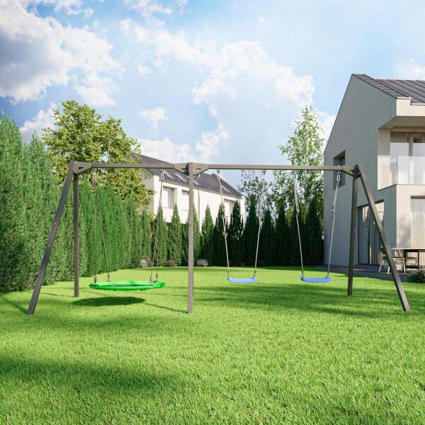 Ocelový rám na zahradní houpačky MARBO Sport MO-014 který je ideálním doplňkem pro dětské hřiště na vaší zahradě, nebo chalupě - snadno, příjemně a se zárukou bezpečnosti pro vaši rodinu. Závěsy pro 2 klasické houpačky 1 velkou, kruhovou houpačku umožňují všestranné a flexibilní využití konstrukce, a šetří tak místo na zahradě. Použití závěsů s ložisky výrazně zvyšuje komfort houpačky.