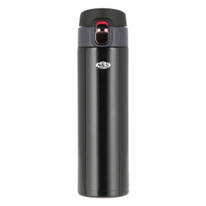 Termoska o objemu 0,5 litru. Dvojitá, izolační ocelová stěna. Šroubovací uzávěr s těsněním. Hmotnost 300 g.
