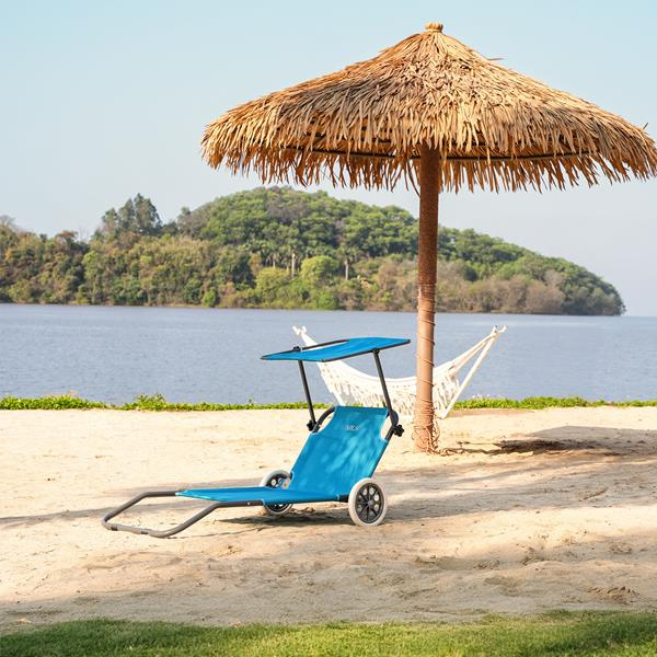 Na zadní části konstrukce jsou umístěna dvě transportní kolečka, která výrazně usnadňují přesun lehátka. Stačí lehce zvednout přední část a vést ho jako kufr – bez nutnosti zvedání nebo demontáže. To je obzvlášť užitečné na pláži, v kempu nebo když je třeba rychle přesunout lehátko na slunnější či zastíněné místo.