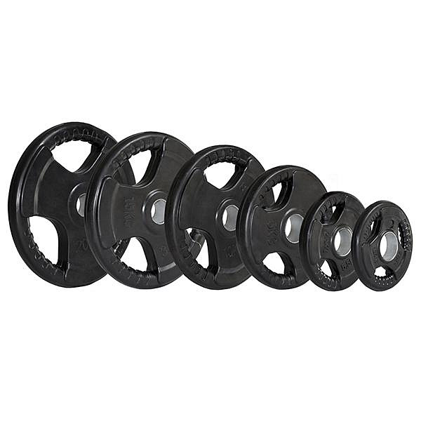 Olympijský, pogumovaný kotouč HMS Tri-grip je známkou kvality a precizního provedení. Tento talíř má otvor o průměru 50 mm, je tedy vhodný pro všechny typy olympijských os. Závaží disponuje třemi držadly pro snadnou manipulaci a pogumovaný povrch prodlužuje jeho životnost.