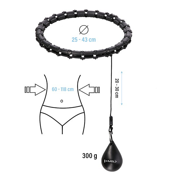 HMS HHW02 je hula hop obruč s nastavitelnou délkou, masážními výstupky a rotujícím závažím.