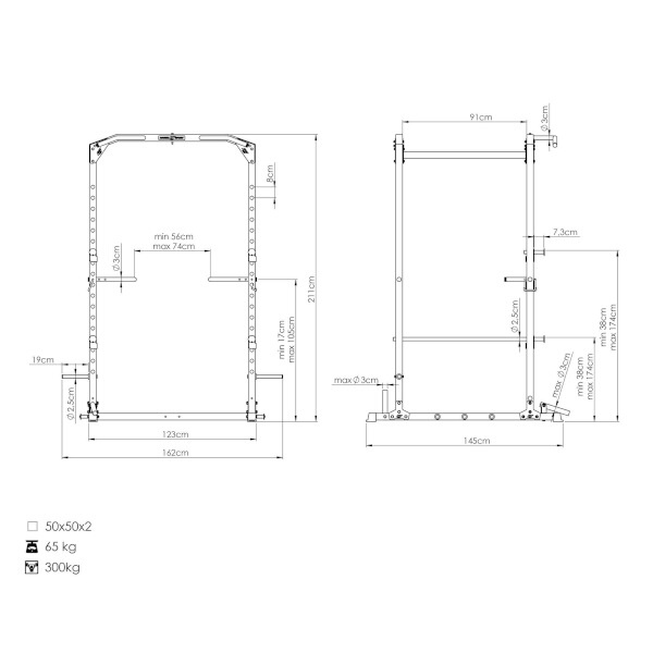 Hrazda ve výšce 210 cm nabízí více úhlů úchopu pro rozmanitý trénink zad a paží. Ve středu rámu se nachází oko pro zavěšení boxovacího pytle, což rozšiřuje využití racku i o kondiční a bojový trénink.
