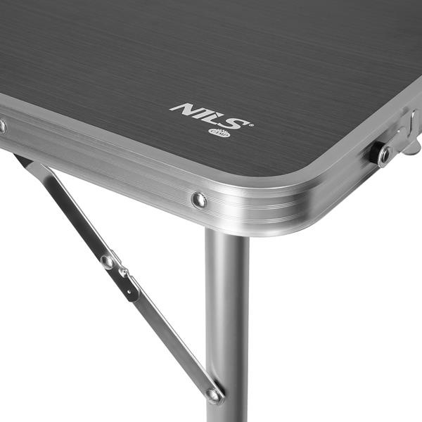 Stůl má desku o rozměrech 120 x 60 cm, která je vyrobena z laminované MDF desky. Pevná, lehká hliníková konstrukce zajišťuje odolnost a stabilitu. Výšku stolu lze nastavit ve třech úrovních (55, 61,5 a 70 cm), což umožňuje pohodlné používání jak dětem, tak dospělým. Stůl se jednoduše skládá – po složení nohou a „přeložení“ na polovinu vznikne kompaktní kufřík o rozměrech 60 x 60 x 6,5 cm. Na boku je praktická rukojeť, která usnadňuje přenášení celé sady.