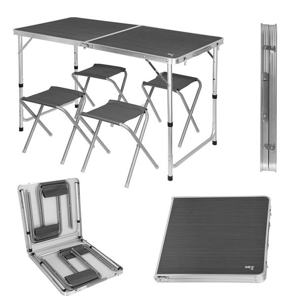 NILS Camp NC1633 je praktická sada skládacího, kempingového stolu a 4 židliček. Rozměry stolu 120x60 cm, nosnost 30 kg. Rozměry židliček 35 x 33 x 28 cm, nosnost 80 kg.Více