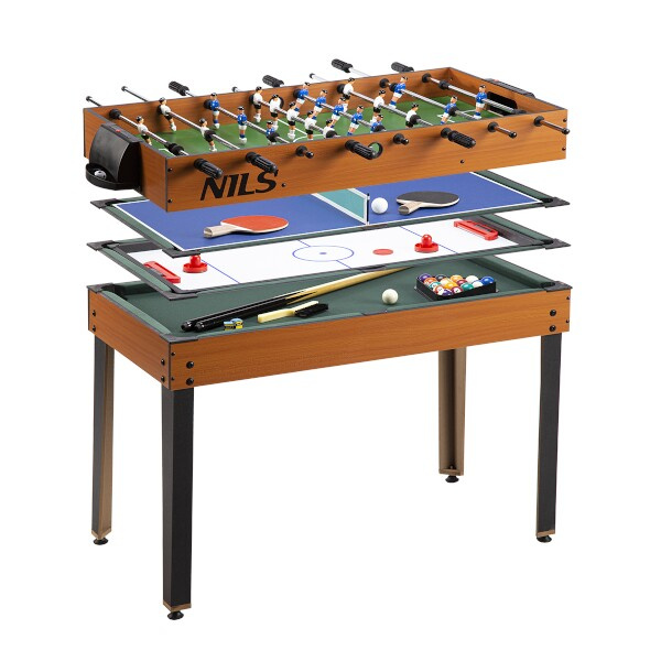 Multifunkční herní stůl NILS SDM 4v1, který obsahuje nejoblíbenější hry jako je - fotbálek, billiard, air hokej a stolní tenis. To vše na jednom místě s jednoduchou výměnou herní desky. Tento model je vyroben z kvalitního MDF, odolného vůči jakémukoliv poškození. Všechny 4 hry jsou dodávány včetně příslušenství.