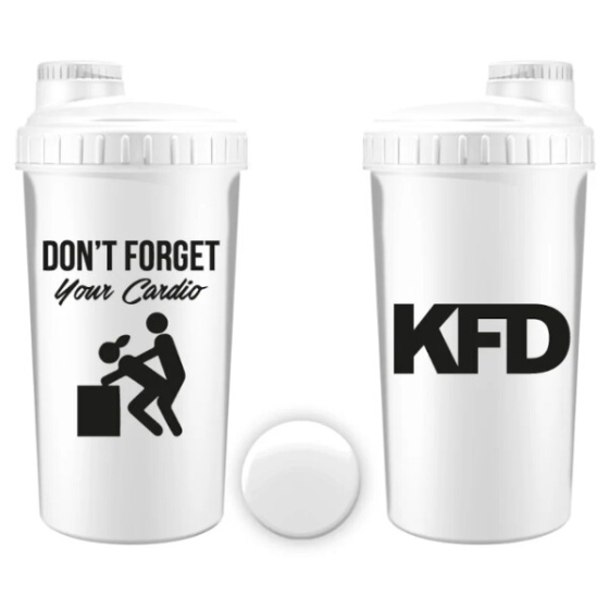KFD PRO Shaker je profesionální šejkr o objemu 700 ml se sítkem a odměrkou na boku. Nabízený šejkr je v bílé barvě. Každý šejkr je potištěn logem KFD a sloganem "DON´T FORGET Your Cardio". Šejkry jsou vyrobeny velmi profesionálně, díky čemuž velice dobře těsní. Po pečlivém zašroubování víka a zátky není možné, aby se obsah z uzavřeného šejkru vylil. Samotná nádoba je lehce průsvitná, takže přesně vidíte množství tekutiny. Ideální pro přípravu proteinových koktejlů, gainerů a dalších přípravků, které vyžadují smíchání s tekutinou. Součástí šejkru je vyjímatelné sítko.