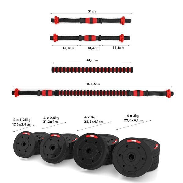 Kompletní nakládací sada dvou jednoručních a jedné obouruční činky o celkové hmotnosti 40 kilogramů, to je HMS SGP40. Nakládací činky patří ke klasickému vybavení každé domácí posilovny.