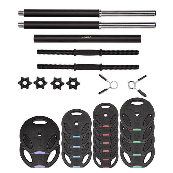 Kompletní nakládací sada dvou jednoručních a jedné obouruční činky o celkové hmotnosti 62 kilogramů, to je HMS SGSP60. Nakládací činky patří ke klasickému vybavení každé domácí posilovny.