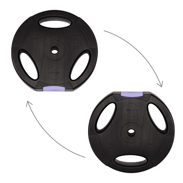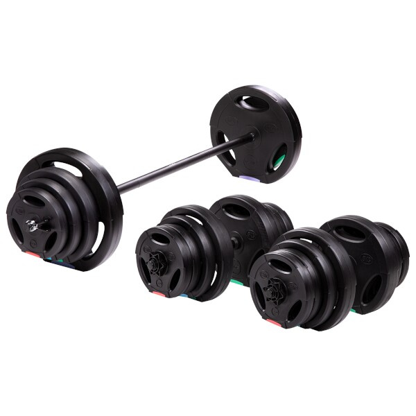 Kotouče jsou vyrobeny z trvdého plastu, který je vyplněn cementem. Obouruční osa je tvořena ze tří částí, které se do sebe skládají pomocí šroubení. Nakládací trny jsou hladké a závaží se zajišťuje pružinovými svorkami. Trny jednoručních činek jsou opatřeny závitem a závaží je jištěno hvězdicovými maticemi.