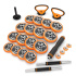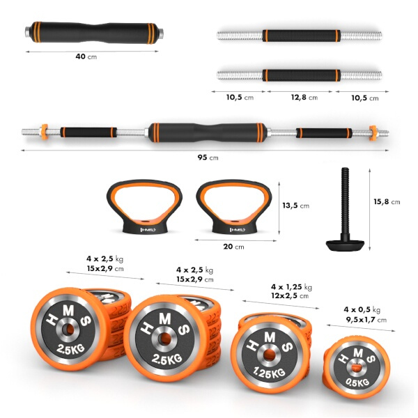 HMS SGN130 6v1 je variabilní a všestranná sada nakládacích činek, která umožňuje provádět širokou škálu silových cvičení s jednou sadou. Sada SGN130 6v1 se skládá z 16-ti kotoučů, dvou krátkých os, jednoho spojovacího dílu, dvou úchopů a dvou nakládacích trnů pro kettlebell a uzávěrů. Kombinováním jednotlivých dílů můžete vytvořit vždy jednu z následujících 6-ti sestav.