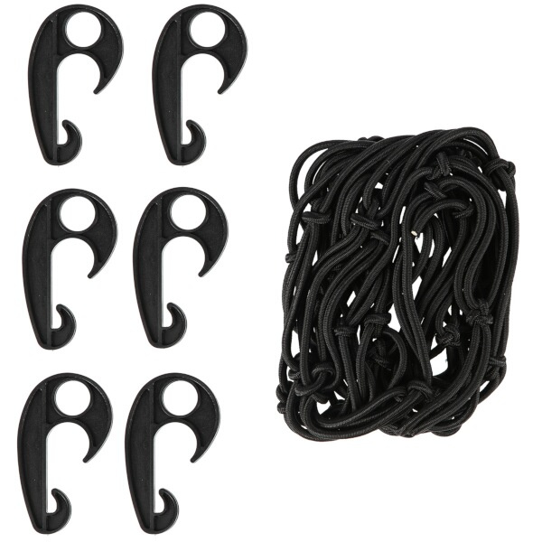 Síť má rozměry 72 x 48 centimetrů a lze ji natáhnout do rozměru 135 x 75 cm. Rozměry ok jsou 12 x 12 cm. Součástí balení je 6 plastových háčků, pomocí kterých lze síťku snadno a rychle upevnit.