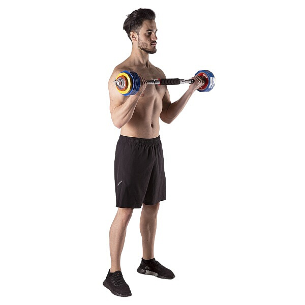 Činky jsou vyrobeny z vysoce kvalitní, chromované oceli, která je zárukou dlouhé životnosti. Kotouče jsou pokryty vrstvou PVC, které chrání jak podlahu, tak samotné kotouče před poškozením v případě nechtěného upuštění činky. Kotouče se proti posunutí zajišťují šroubovacími zámky, které jsou dodatečně jištěny šroubem s křídlovou matkou.