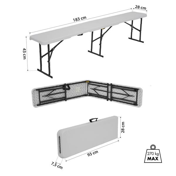 Skládací kempingová lavice. Rozměry v rozloženém stavu 183 x 28 x 43 cm, po složení 93 x 28 x 7,5 cm. Nosnost 270 kg, hmotnost 6,5 kg.Více