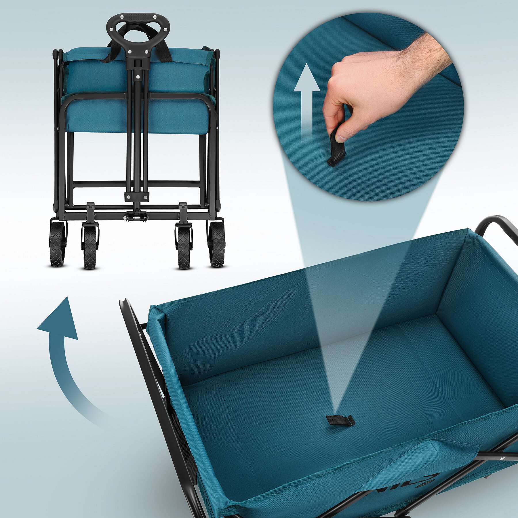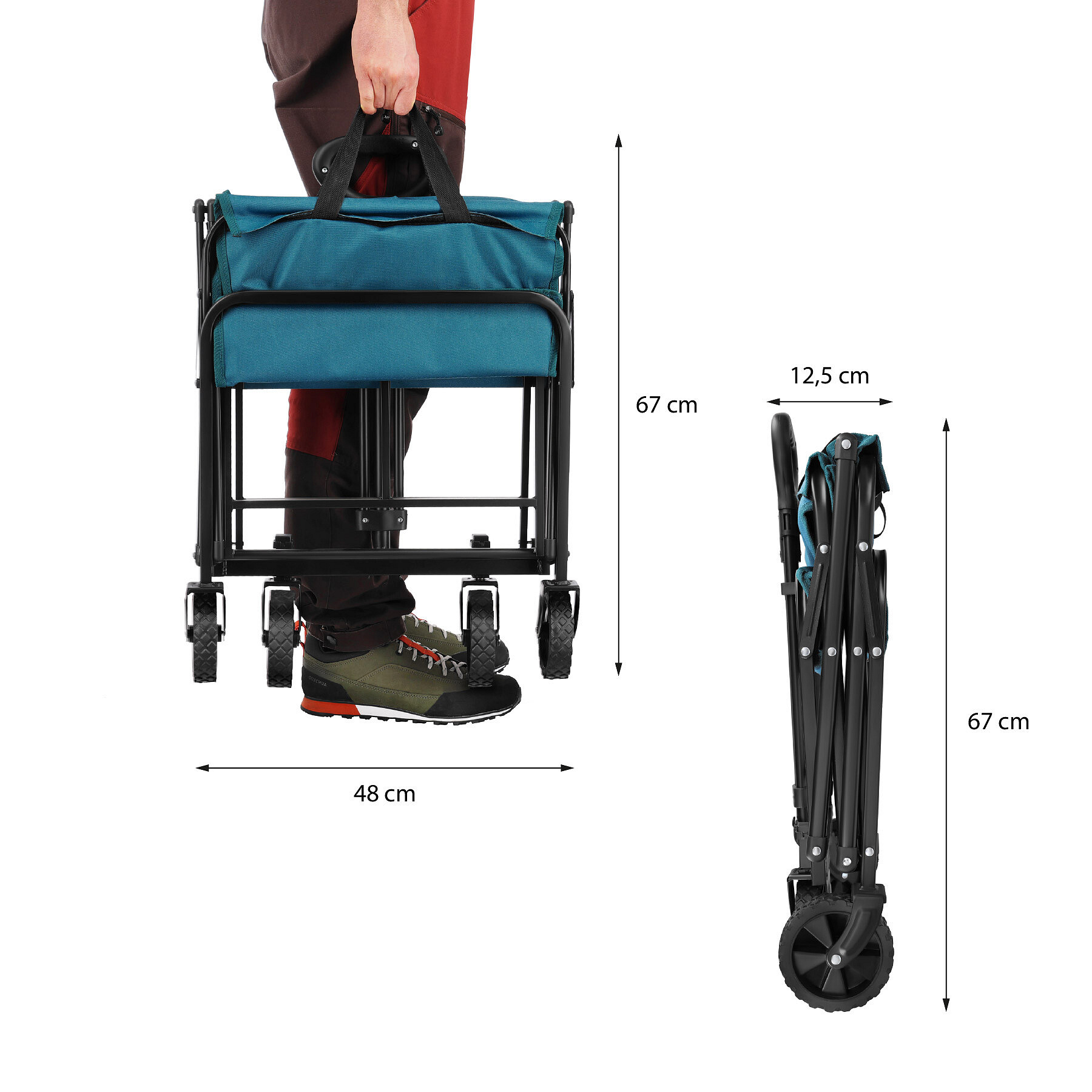 Velkou výhodou je rychlý skládací systém a jednoduchá montáž. Vozík připravíte k použití během několika okamžiků a po skončení jej stejně rychle složíte. V kompaktním stavu se snadno vejde do kufru auta a doma zabere minimum místa, takže jej můžete mít vždy připravený na další výlet nebo náročný den plný aktivit.