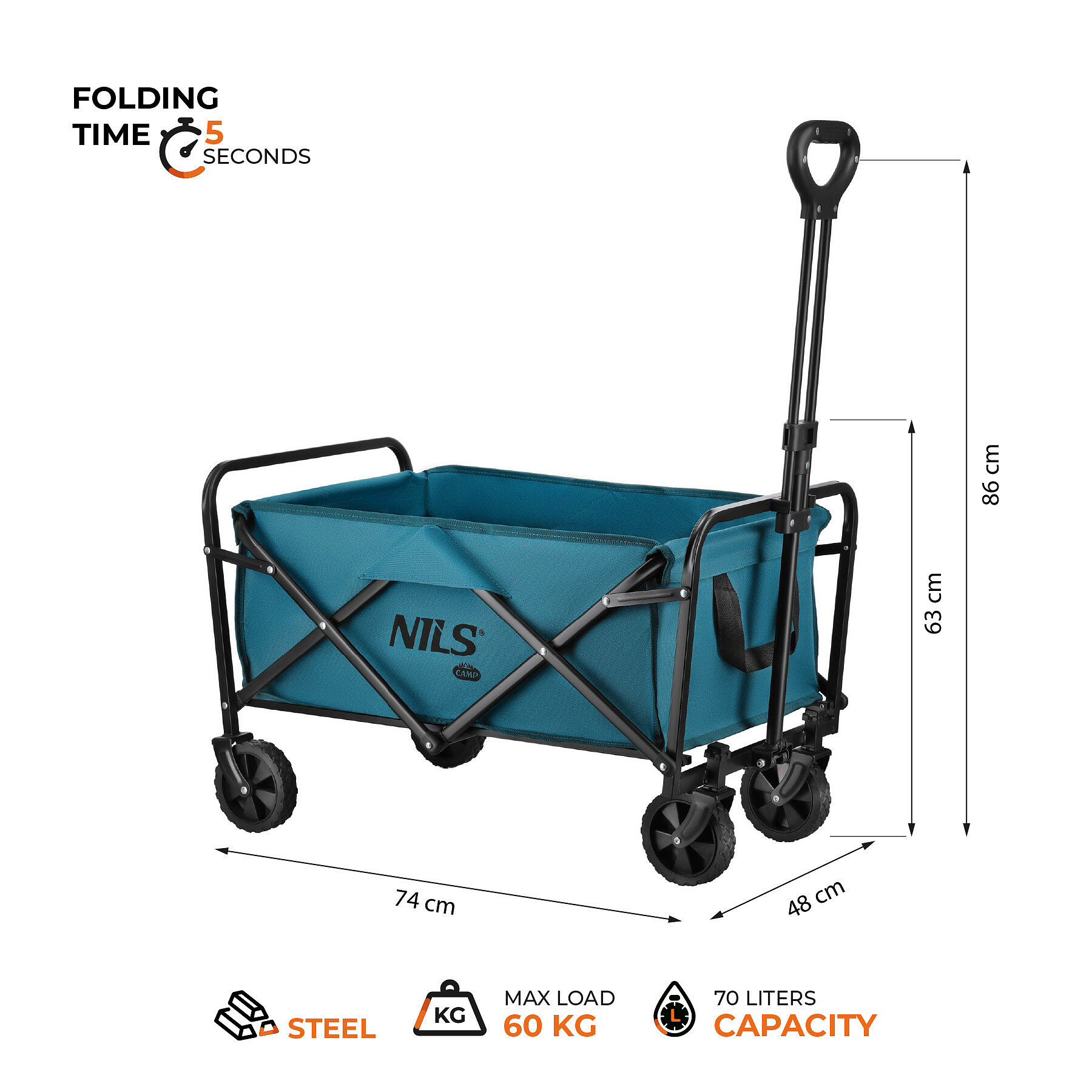 Vozík nabízí objem 70 litrů, takže poskytuje dostatek prostoru pro věci, které je běžně obtížné přenášet najednou – například deku, tašky, vybavení na piknik, sportovní doplňky nebo zásoby na celý den. Maximální nosnost až 60 kg umožňuje přepravu i těžších předmětů bez zbytečné námahy.