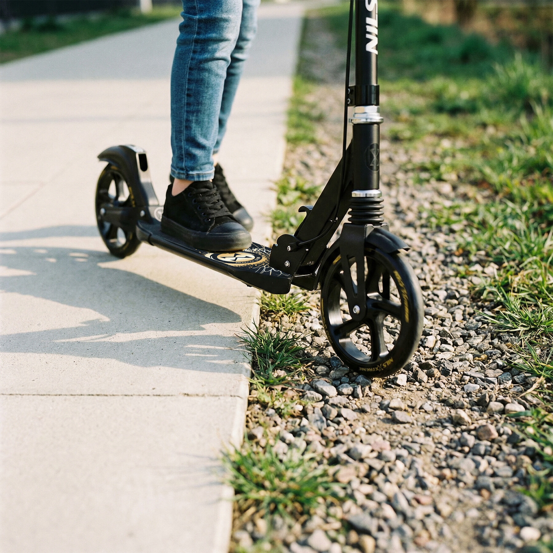 Kola o průměru 200 mm umožňují hladkou jízdu na asfaltu, chodnících i dlažbě. Odolná konstrukce z kombinace oceli a hliníku zvyšuje bezpečnost a životnost, přičemž si koloběžka zachovává optimální hmotnost.