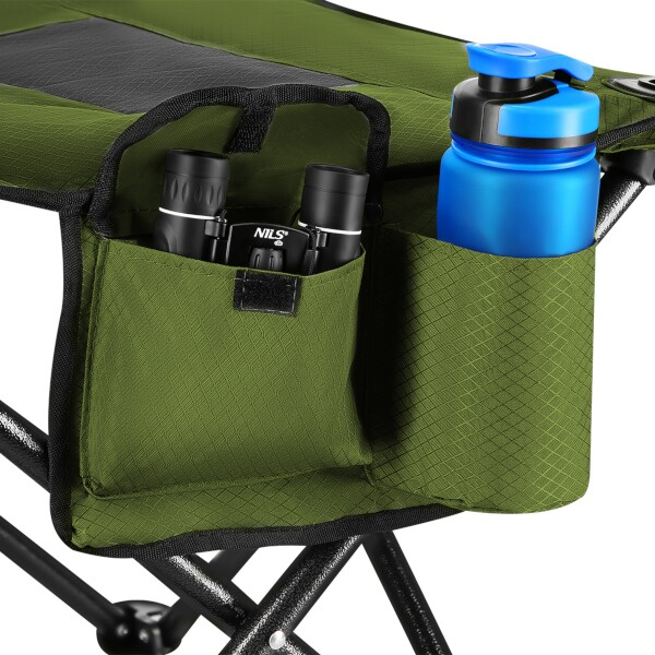 Pokud zvažujete pořízení skládacího křesla, ve kterém budete sedět dlouhé hodiny, nebo chodíte například na ryby, pak je pro Vás jistě nejdůležitějším parametrem pohodlí, a to splňuje model NC3075 na jedničku. Potah křesla je ušit ze 2 vrstev polyesteru v úpravě oxford 600D, prostor mezi vrstvami je vyplněn měkkým materiálem podobným vatě. Potah je v několika místech prošit, aby polstrování zůstalo na svém místě a křeslo tak zůstane po dlouhou dobu stejně pohodlné. Výška sedu je 49 centimetrů. Dalším prvkem, který zvyšuje pohodlí jsou plnohodnotné područky, o které se můžete s jistotou opřít, když do křesla usedáte, nebo z něj vstáváte. Na pravé straně pak naleznete kruhovou kapsu, do které lze odložit například kelímek s nápojem anebo půllitrová láhev, a kapsu s klopou na suchý zip, do které se vejde například peněženka, kapesní dalekohled, nebo mobilní telefon.