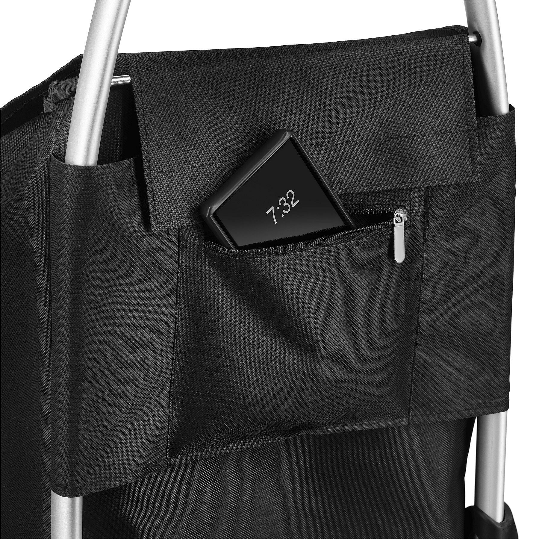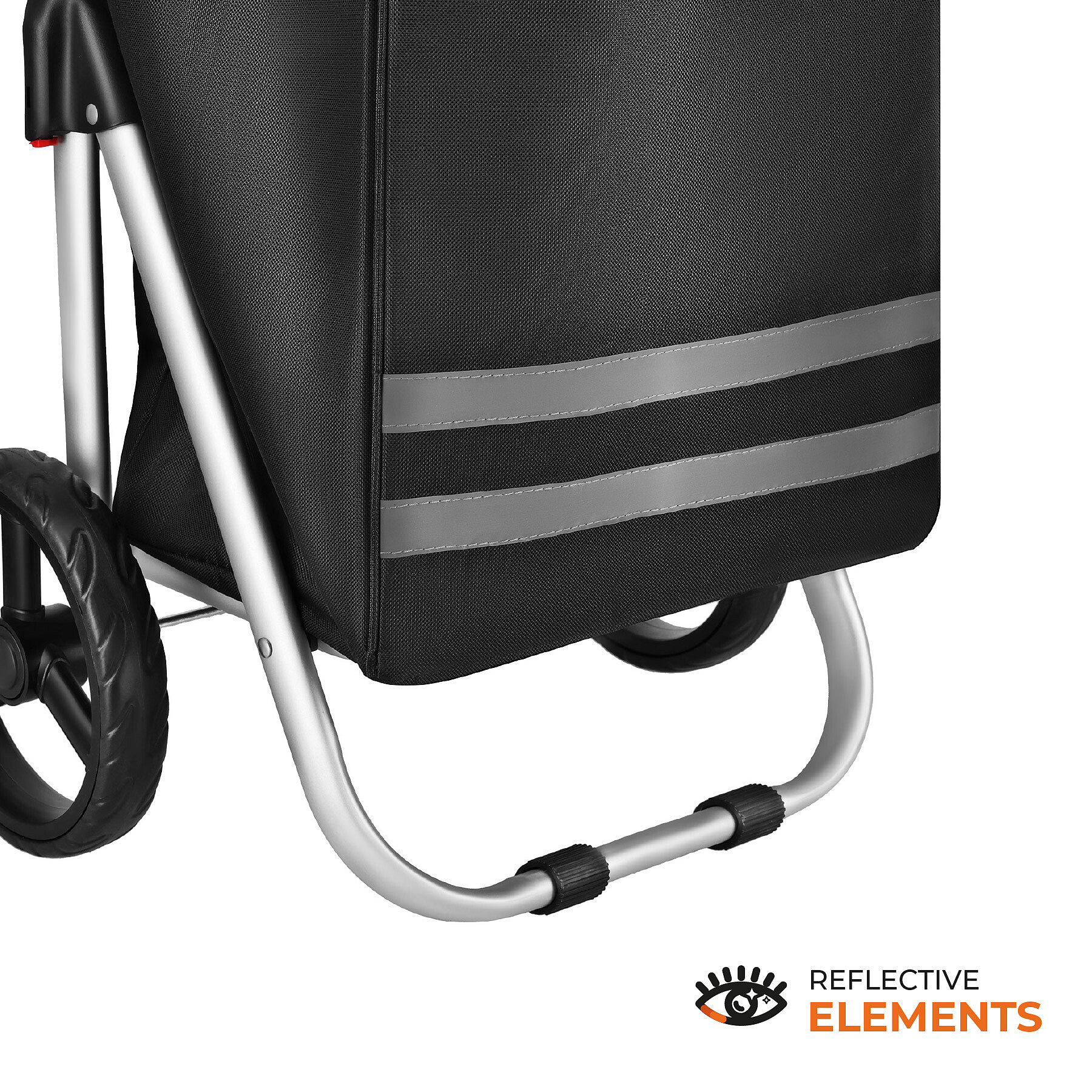 Hlavní komora je zajištěna stahovací šňůrkou se stopperem a navíc uzavírána klopou, což chrání obsah během přepravy. Vozík je také vybaven vnější kapsou na zip pro drobnosti a reflexními prvky, které zvyšují viditelnost za šera nebo ve zhoršených světelných podmínkách. Taška je ke konstrukci připevněna pomocí suchých zipů, takže ji lze snadno nasadit nebo sundat.