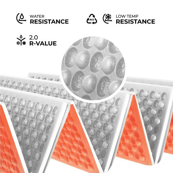 Jádro karimatky je vyrobeno z technické pěny XPE – materiálu, který se vyznačuje nízkou hmotností, vynikající odolností proti deformaci a mechanickému poškození. Pěna XPE nesaje vodu, což znamená, že karimatka zůstává suchá a připravená k použití i v náročných terénních podmínkách.