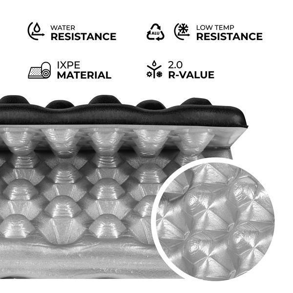 Podložka je vyrobena z vysoce kvalitní pěny IXPE – materiálu, který se vyznačuje zvýšenou pružností a odolností, a zároveň zůstává lehký, odolný a nesaje vodu. IXPE si zachovává svůj tvar i při intenzivním používání, což zaručuje dlouhodobý komfort.