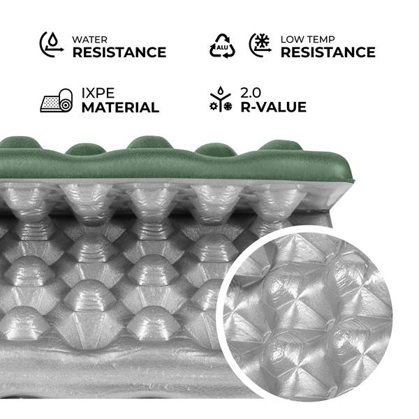 Podložka je vyrobena z vysoce kvalitní pěny IXPE – materiálu, který se vyznačuje zvýšenou pružností a odolností, a zároveň zůstává lehký, odolný a nesaje vodu. IXPE si zachovává svůj tvar i při intenzivním používání, což zaručuje dlouhodobý komfort.