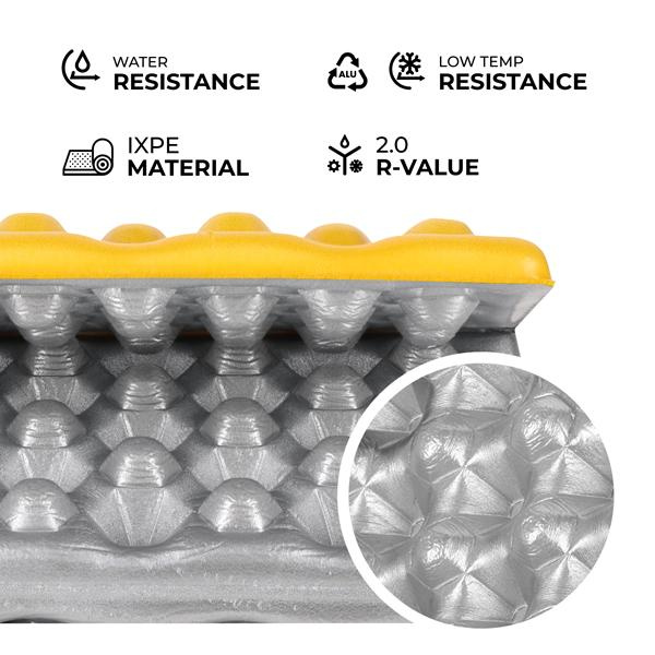 Podložka je vyrobena z vysoce kvalitní pěny IXPE – materiálu, který se vyznačuje zvýšenou pružností a odolností, a zároveň zůstává lehký, odolný a nesaje vodu. IXPE si zachovává svůj tvar i při intenzivním používání, což zaručuje dlouhodobý komfort.
