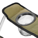 Loketní opěrky mají možnost regulace výšky jednoduchým posunem zadní části po profilu konstrukce. Pravá opěrka lokte je opatřena košíkem, do kterého se pohodlně vejde menší láhev, nebo vysoká sklenice. Pro snadné přenášení lze židli složit.