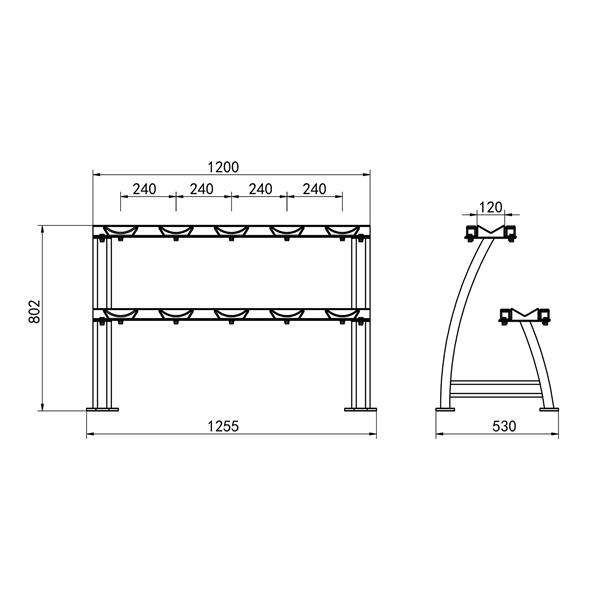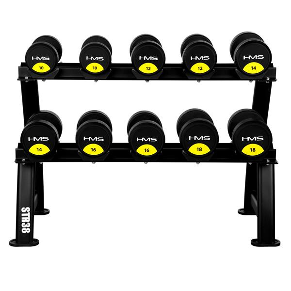 Stojan STR38 nabízí dvě úrovně pro uložení až 10 párů činek. Díky mírně nakloněnému povrchu je úchop činek pohodlný a nevyžaduje nadměrné ohnutí zápěstí, což snižuje zátěž kloubů a zvyšuje pohodlí.