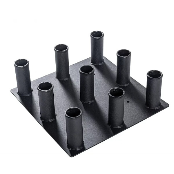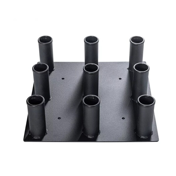 Stále se Vám osy povalují po zemi a nemáte je kam uložit? Nebo nemůžete využít nástěnných držáků na osy? Jednoduchým řešením je StrongGear stojan na 9 os – určený k uložení všech druhů os s průměrem nakládací části 50 mm, od naší EZ osy až po Power bar. Je vyroben z kvalitní oceli, nalakován práškovou barvou a díky otvorům v základní desce je možné jej přišroubovat k podlaze. Vnitřní průměr trubek je 51 mm, rozměry základny jsou 50x50 cm.