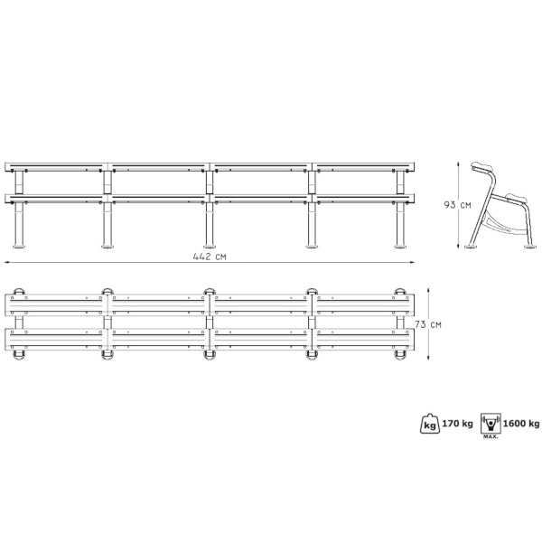 - 2 odkládací plochy v délce 440 cm z ocelového profilu tloušťky 4mm