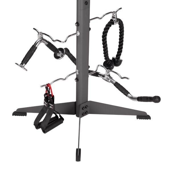 Stojan STR33 má širokou základnu o rozměrech 55 x 55 centimetrů pro skvělou stabilitu a pevnost. Stojan je vybaven osmi háčky, na které můžete zavěsit různé fitness doplňky, jako jsou švihadla, adaptéry ke kladkám nebo například odporové gumy. Každý háček zvládne zatížení až 30 kg a díky jeho tvaru lze na každý háček zavěsit více kusů vybavení bez obav o pád z háčku.