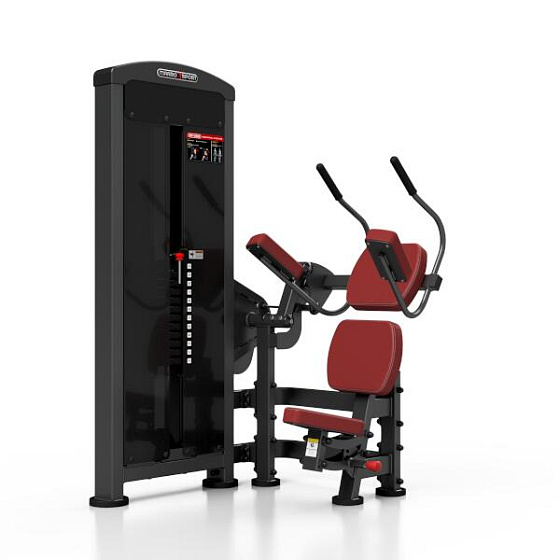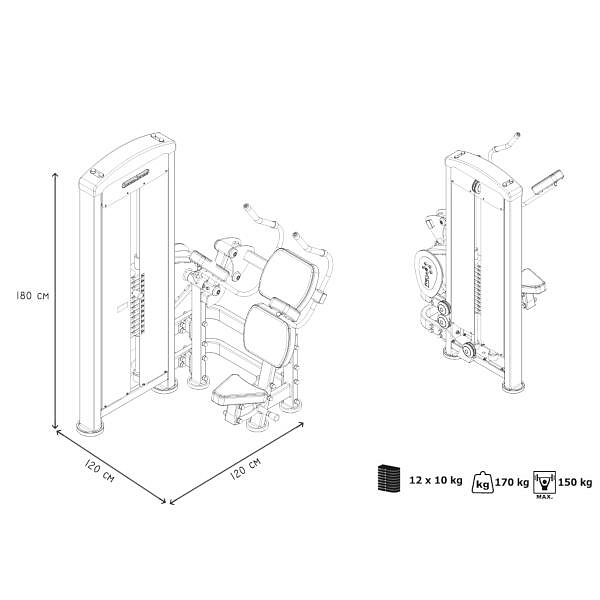 Stroj na posílení břišních svalů MARBO MP-U223 je nekompromisní, profesionální vybavení pro Vaší posilovnu. Pro výrobu byly zvoleny ocelové profily 120x60x3mm a 80x40x3mm, které zaručují nečekanou trvanlivost. Zátěž tvoří 12ks 10kg cihel. Celková váha závaží dodávána se strojem je tedy 120kg a je možné ji rozšířit až na 160kg. Regulace výšky sedadla je nastavitelná ve čtyřech úrovních za použití červeného, pneumatického jistícího kolíku. Napínaní lanek se provádí regulací 4 šroubů na hlavním vodícím kole. Odpadá tak složité rozebírání stroje. Polstrovaní je ze syntetické kůže sešité režnou nití značky COATS vyplněné tvrdou pěnou, to celé ja na 3mm hrubé, ocelové desce. Tichý chod zajištuje zakrytování černým plastem, z přední části je kryt opatřen průhledem pro snadné nastavení požadovaného počtu cihel. Stroj je navíc opatřen velikou samolepkou, která instruuje cvičence, jaké cviky jdou na stroji provádět a které skupiny svalů daný cvik posiluje.