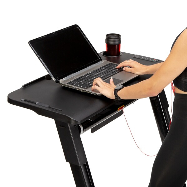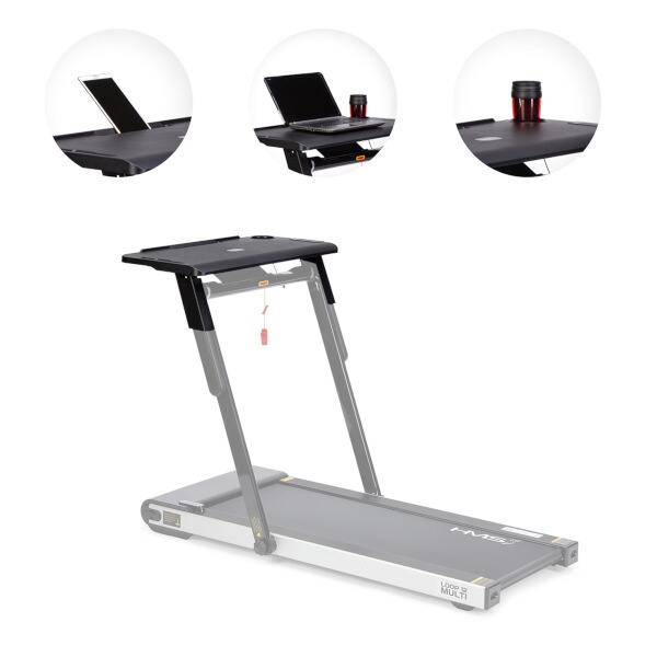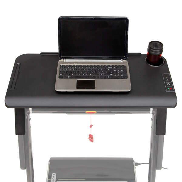 Díky stolu bude nyní možné kombinovat práci a fyzickou aktivitu. Připojení stolu omezuje rychlost běžeckého pásu na 6 km/h, takže obsluha notebooku při chůzi nebude problém. Na stole je umístěn držák na láhev nebo kelímek a nechybí ani držák na tablet. Díky speciálnímu ovládacímu panelu můžeme běžecký pás kdykoli zpomalit nebo vypnout. Stůl se snadno sestavuje a připojení k běžeckému pásu se provádí pomocí jediného kabelu. Takové řešení je skvělou alternativou k práci za stolem.