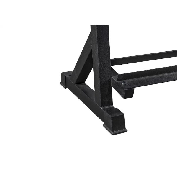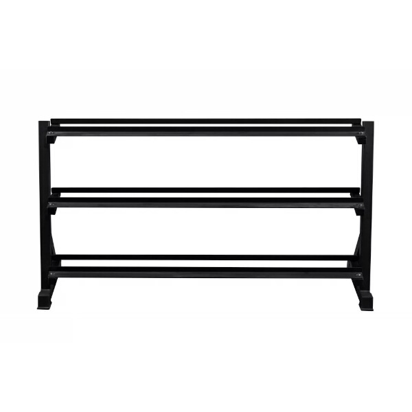 Výhodou tohoto stojanu jsou především kompaktní rozměry. Se šířkou 160 centimetrů moc místa nezabere, ale díky třem patrům se na něj vejde mnoho jednoručních činek. Každé patro je široké 150 centimetrů, takže celkem máte k dispozici 450 centimetrů úložného prostoru (to je například prostor pro 32 kusů 12,5 kg hexagonálních činek).