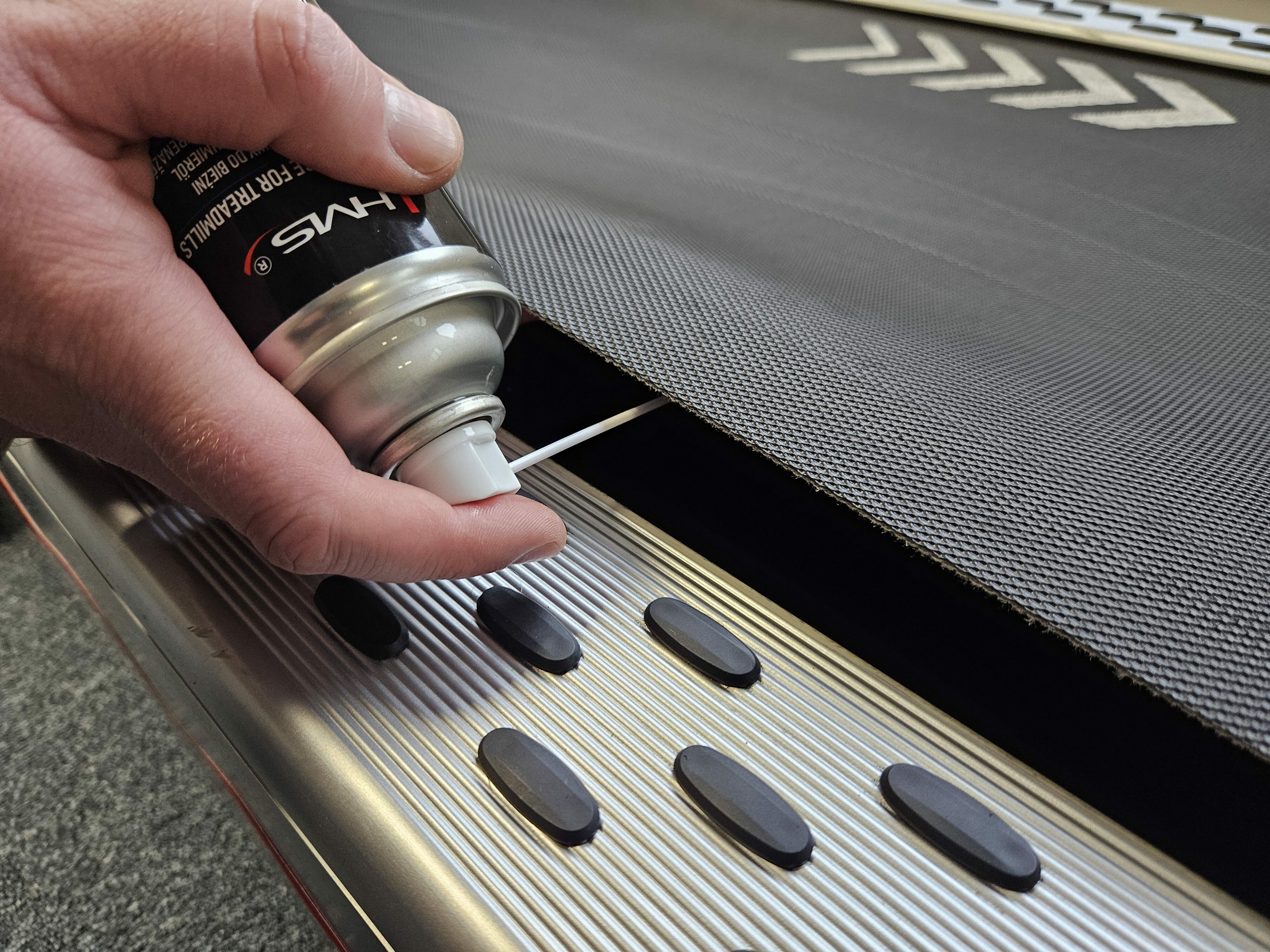 Nejprve odpojte běžecký pás od elektrické zásuvky. Poté použijte imbusový klíč k uvolnění šroubů na zadní straně běžeckého pásu jejich otáčením proti směru hodinových ručiček. Tím se pás uvolní, takže jej můžete zvednout. Poté co zvednete pás, naneste silikonové mazivo ve spreji - začněte jednou stranou pásu, naneste mazivo a pak to stejné proveďte i na druhé straně. Po dokončení připojte běžící pás zpět do zásuvky a nastavte jej na nízkou rychlost, aby se mazivo rovnoměrně rozprostřelo po celé ploše pásu. Na závěr otřete přebytečné mazivo po stranách a dotáhněte šrouby pro napnutí pásu, přičemž dbejte na to, aby se mazivo nedostalo přímo na běžecký pás. Pokud tuto údržbu budete provádět pravidelně každé 3 měsíce, zajistíte dlouhou životnost a hladký chod stroje.