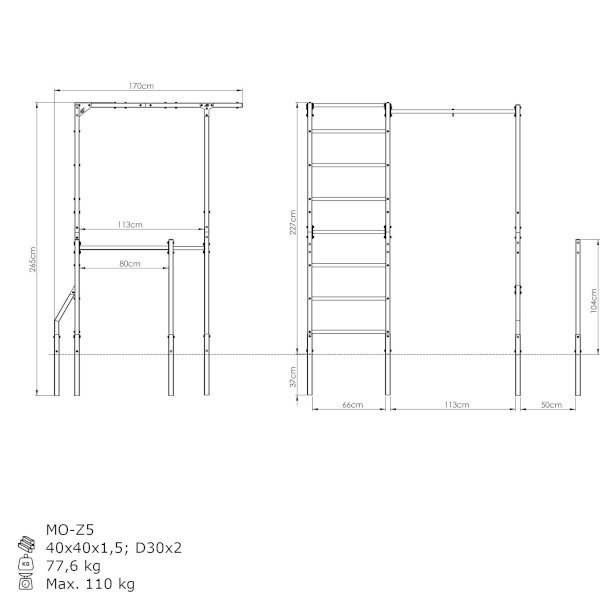 Až 226 cm vysoké, s 6-ti vodorovnými, 7-mi svislými příčkami a k tomu s bradly. Na vodorovných příčkách můžete dělat například přítahy, na bradlech DIPy a posilovat tak svaly horní části těla. Svislé příčky jsou skvělé mimo jiné pro: