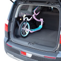 Skládací ocelová konstrukce je lehká, pevná a po složení není problém s koloběžkou cestovat například v autobuse, nebo tramvaji. HM0180 se také snadno vejde do kufru osobního automobilu, kde nezabere moc místa a můžete si ji tak vzít s sebou například na dovolenou.
