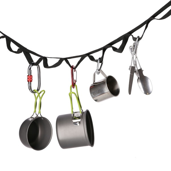 NILS Camp NC1771 je závěsný "lanový" organizér s 19-ti oky pro zavěšení a organizaci kempingového vybavení.