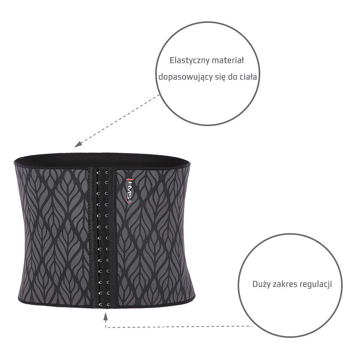 Zeštíhlující, bederní pás HMS GR222 je vyroben z neoprenu a polyesteru, kombinace těchto materiálů je velice nápomocná, pokud chcete zhubnout v oblasti břicha. Během fyzické aktivity pás GR222 zachycuje generované teplo, tím dochází k zahřívání pokožky na břichu, začíná se zrychlovat metabolismus a spolu s tím se začíná spalovat tuková vrstva pod pásem. Domplňující vlastností bederního pásu GR222 je optické tvarování dámské postavy kdy po nasazení zůží pas v oblasti beder a zároveň zvýrazní hrudník.